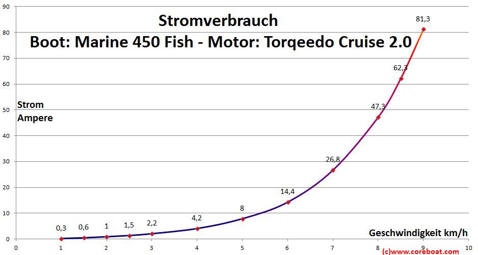 Das Boot lief bei Vollgas mit maximal 9,2 km/h und der Motor hatte dabei eine Stromaufnahme von knapp über 80 Ampere, also eine Leistung von etwas über 2000 Watt. Dies ist auch die Nennleistung des Toprqeedo.