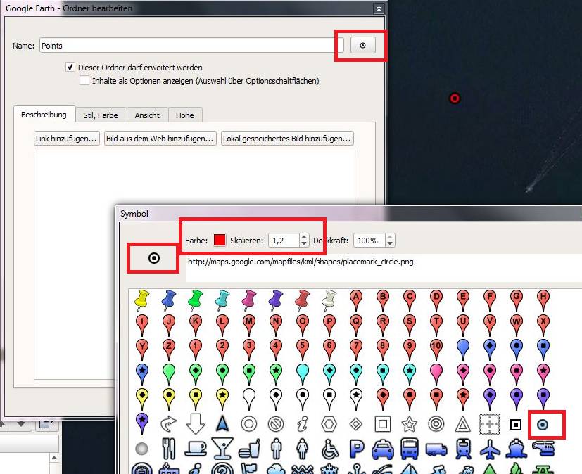 Die fertige Datei kann in Google Earth Pro geöffnet werden. Sie erscheint dort links im Ordner „Temporäre Orte“ und müßte im Kartenbild auf die entsprechende Region eingeschwenkt sein. Die Symbole sind möglicherweise kaum zu sehen, was wir zunächst ändern.