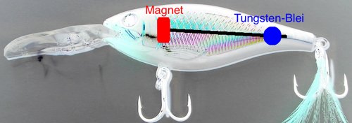 2.) Ein Tungsten-Blei ist auf einem Stahlstab befestigt und kann von hinten nach vorne Laufen. Wenn man auswirft, rutscht das Blei auf dem Starb nach hinten. Beim twitchen rutscht das Bei nach vorne und bleibt an einem Magneten der sich im vorderen Teil befindet hängen.