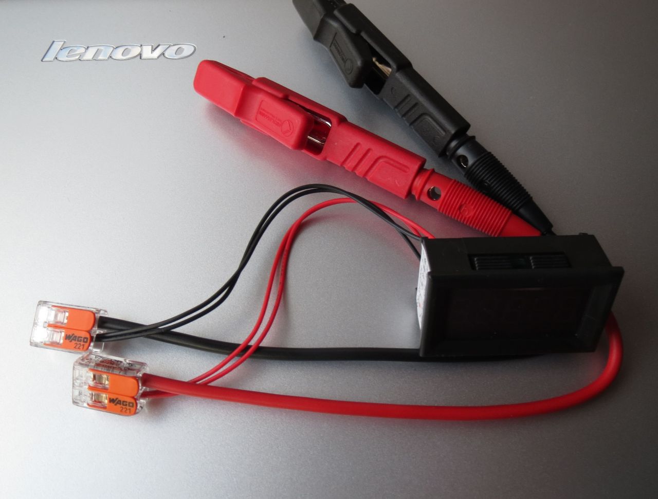 Ein Spannungsanzeige-Display als Anwendungsbeispiel. Es wurden die beiden dünnen Litzen zusammen in einer Öffnung geklemmt.