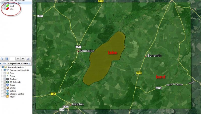 Polygone inGoogle Earth. Hier ein Seenumriß und ein Viereck