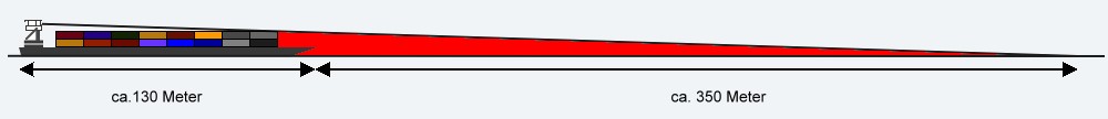 Bei einer Schiffslänge von ca. 130 Metern, ergibt sich vor dem Bug des Berufsschiffes ein toter Bereich der gut 350 Meter lang ist.