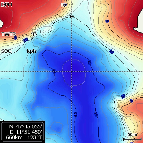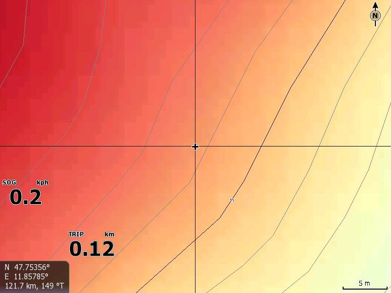 Aber mit Zoomstufen < 50 m verschwindet das ShadedRelief; nur die Vektor Tiefenlinien sind noch zu sehen.