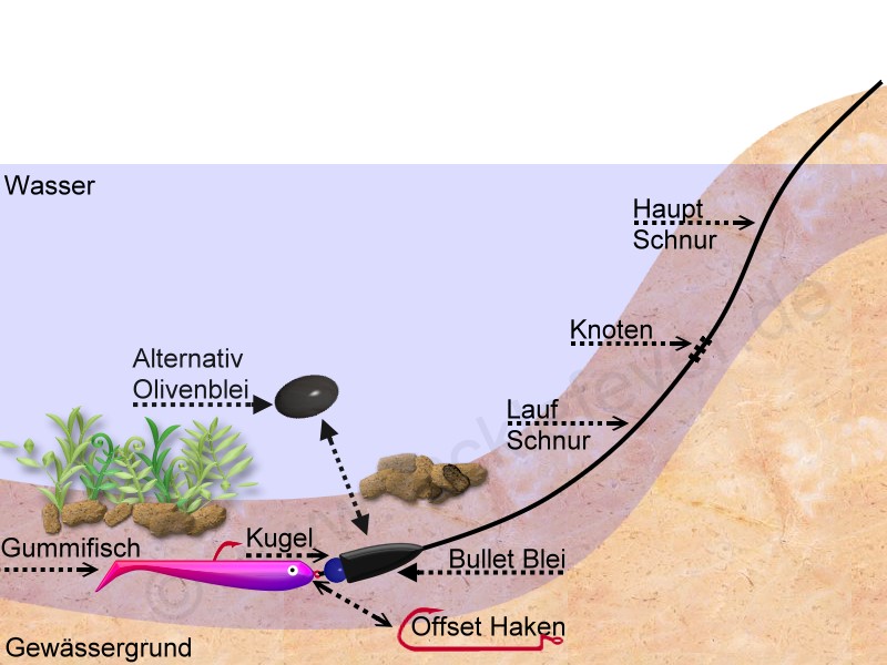 Im Aufbau der Montage unterscheiden sich das Carolina und Texas Rig jedoch ein wenig, z.B. bei der Positionierung des Blei´s und der Kugel.