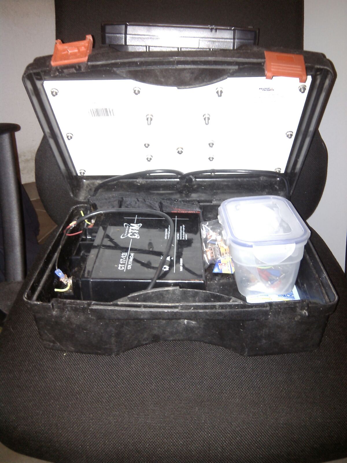 Der Akku (12V, 18Ah) passt zwar grad so in den Plastikkoffer der Tasche, aber dann ist kein Platz mehr, um das Echolot auf dem Koffer zu befestigen, da sich die Schrauben und Akku in die Quere kommen. Zudem wird das dann jedesmal eine gewaltige Tüddelei die Kabel für Strom und Geber von hinten an die Anschlüsse zu befestigen.