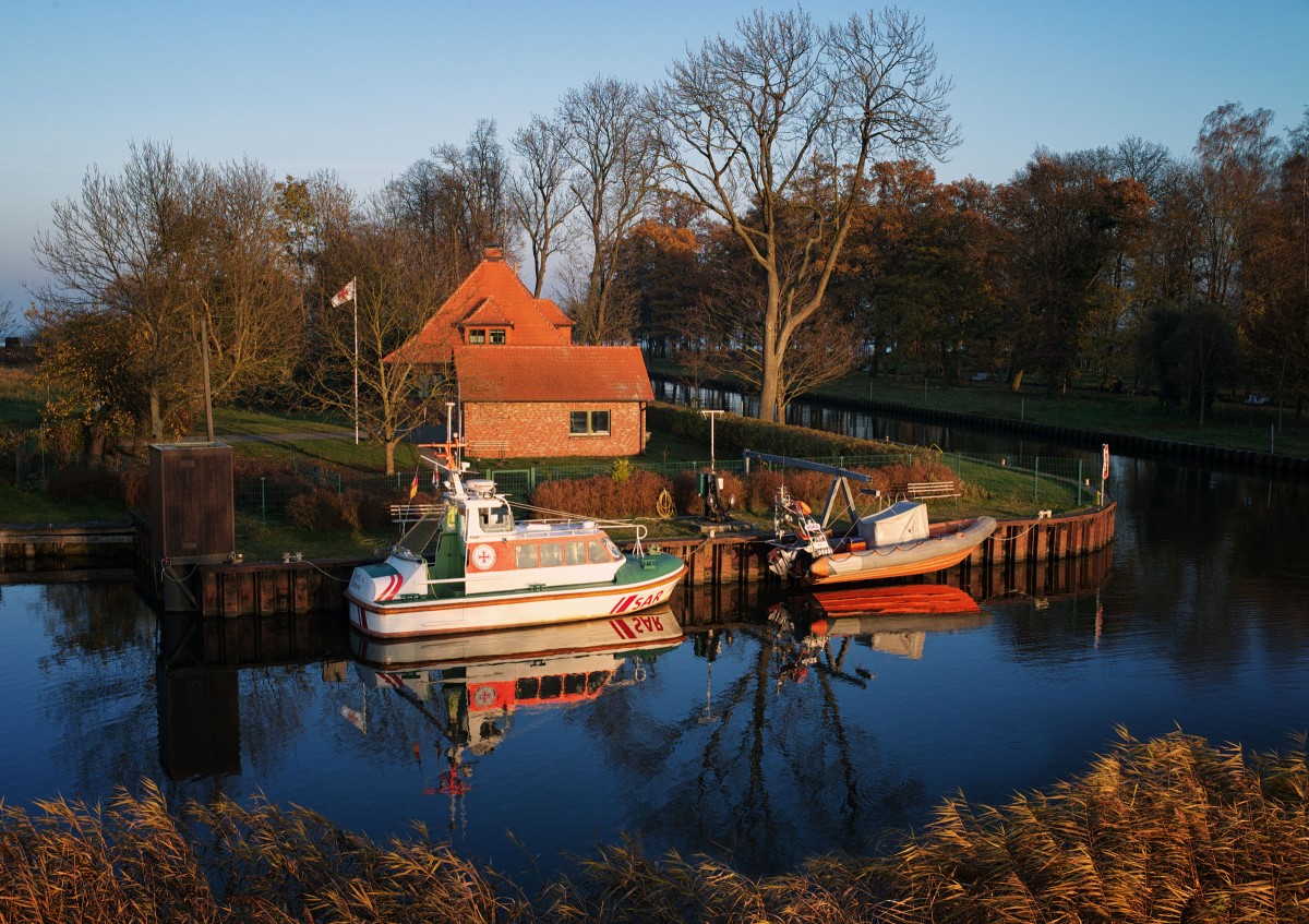 So friedlich liegt das Stationsgebäude der Seenotretter an der Ueckermündung nicht immer da. An dieser Ecke erfasste Starkwind das Boot der Paddelgruppe und trieb es Richtung Haff (hinter den Bäumen). Mit der GERHARD TEN DOORNKAAT (l.) verhinderten die Seenotretter Schlimmeres. Foto: DGzRS – Die Seenotretter/Sven Junge