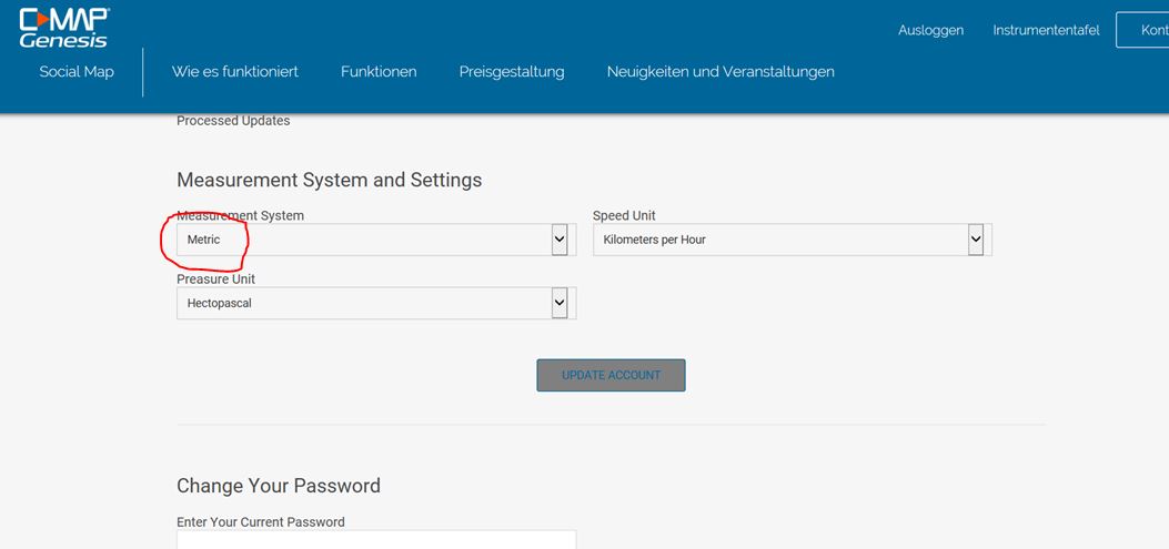 - bei den Konteneinstellungen kann man nun "Metric" bei den Einheiten auswählen