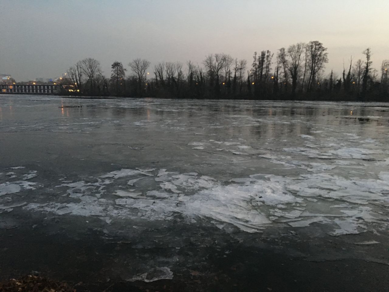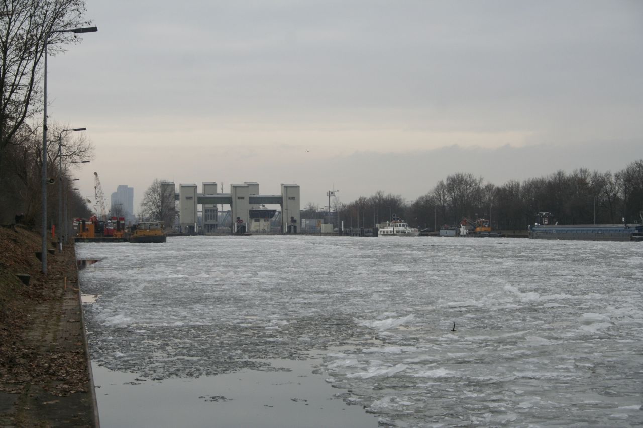 Der Main in Frankfurt trägt oberhalb einer Schleuse auch schon eine Eisfläche: