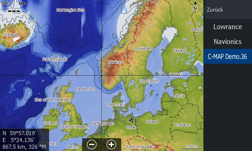 Auf dem Gerät findet sich eine "C-Map Demo.36"-Karte, die aber genau wie die onboard Navionics-Karte wenig hilfreich ist. Schon ab < 50 km Zoom verpixelt das Teil. ist also nur was für den Verkauf, nicht aber funktional von Bedeutung (Screenshot).