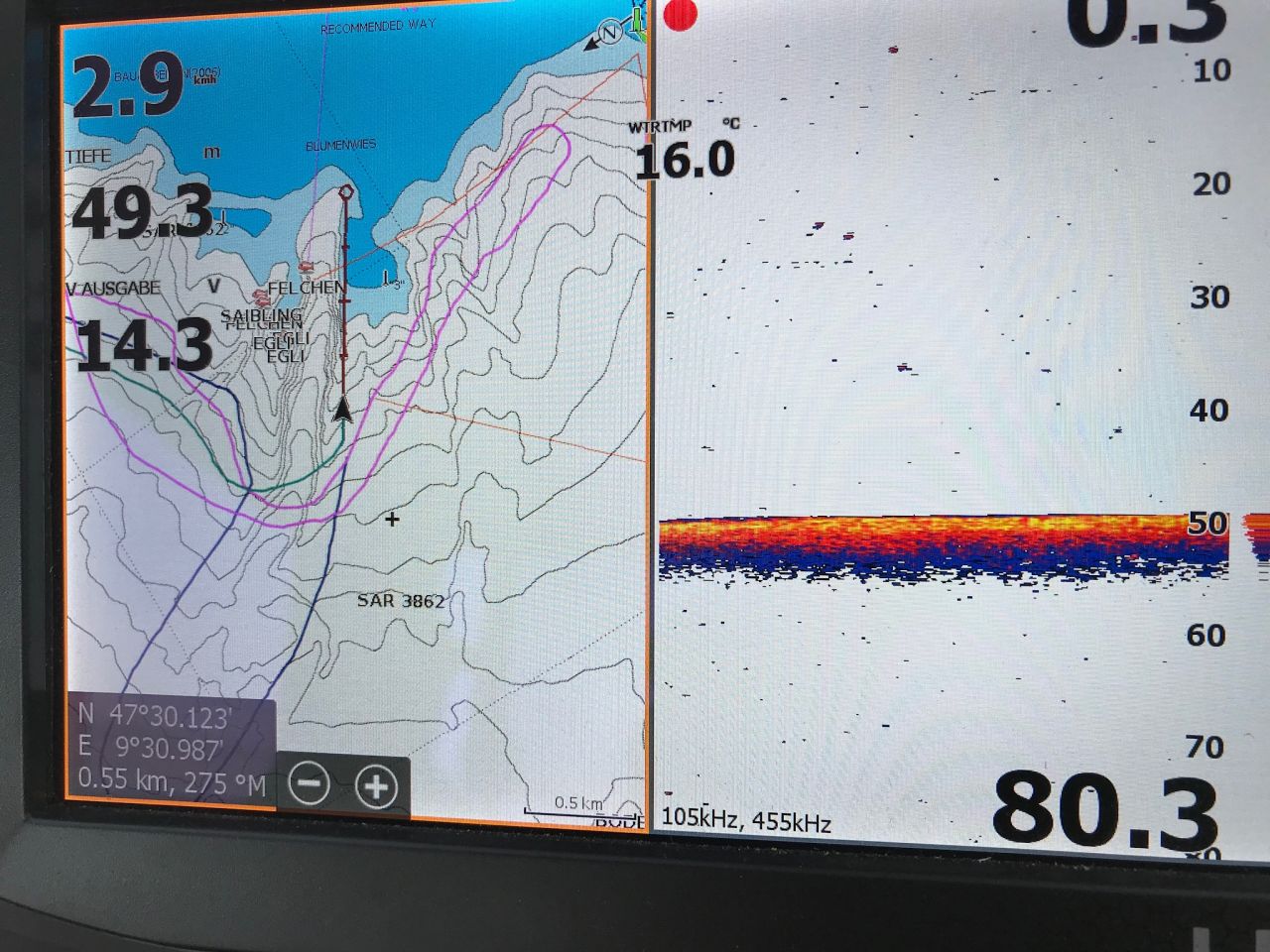 Bei meinem alten Echolot Humminbird 798 Si wurde mir jeweils auch die Wassertiefe am markierten Punkt angezeigt.