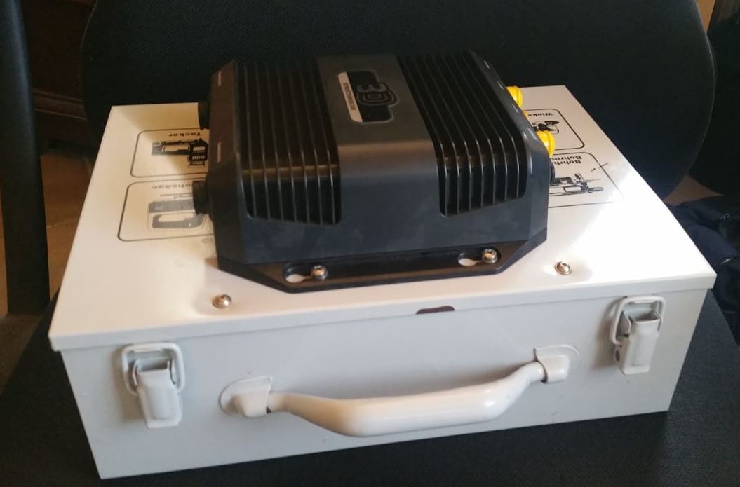 Die 3D Box muss offen liegen und braucht ebenso eine Stromquelle. Also nochmal Motorradakku in einer Werkzeugbox, siehe Foto.