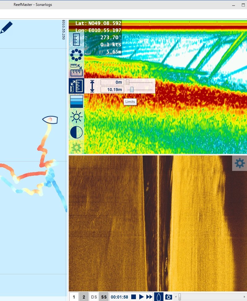 Ideal wären aber ca. 7m, da der Rest des Sonarlogs Bereiche unterhalb der Bodenlinie anzeigt.