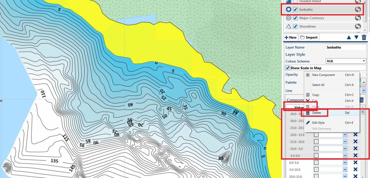 alle Tiefenlinien und Tiefenflächen mit negativen