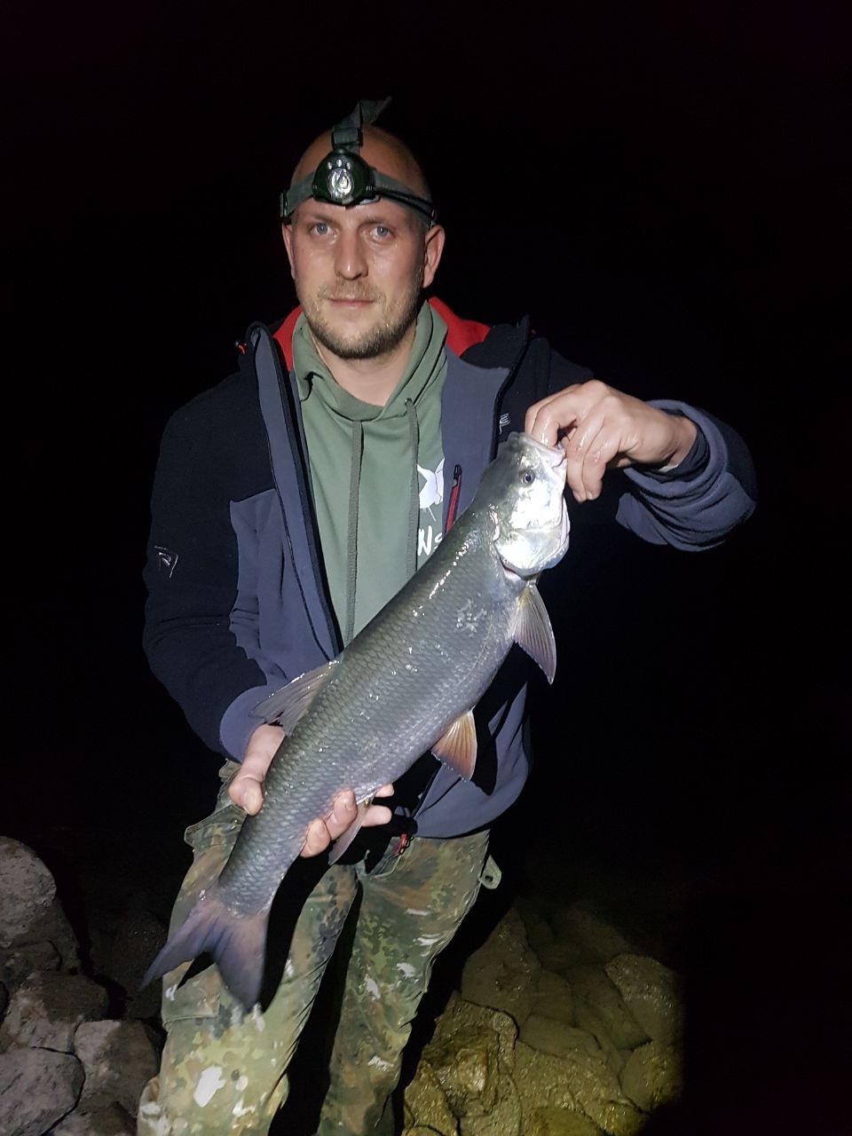 ''42 er Barsch am Strom , Kompflampe vergessen , Drilling hängt im T-Shirt''