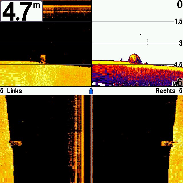 Ich glaube, es gibt ein erstes Ergebnis. Th. Schlageter und R. Scheipers haben heute einen Test gemacht. Wenn man sich das Video auf der Seite mal ansieht (wo der Echolottest gemacht wurde, weiß man ja, wie das bei HB aussieht. Nun heute wurde das am gleichen Objekt mit Lowrance gemacht. Wegen des Exkluiv-Vertrages mit der Zeitschrift Blinker wird der Test erst in der Mai-Ausgabe vom Blinker ganz veröffentlicht. Aber wenn man das eine Foto hier betrachtet: