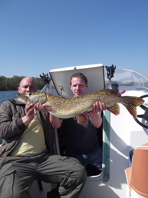 Gestern konnte einer meiner Gäste einen schönen Hecht von 105 cm überlisten, die dame biss auf einer Wassertiefe, von 3,5 metern, es war sein erster Meterhecht und hatte wie imme nee sehr schöne Zeichnung.