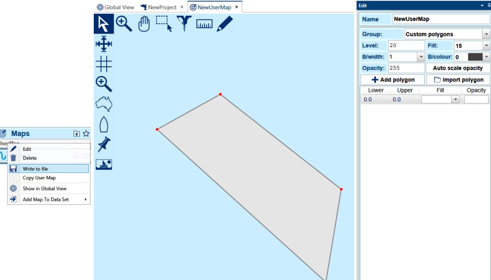 Oder du kannst gleich ein eigenes Polygon in einer leeren "user map" zeichnen und "write to file" exportieren.