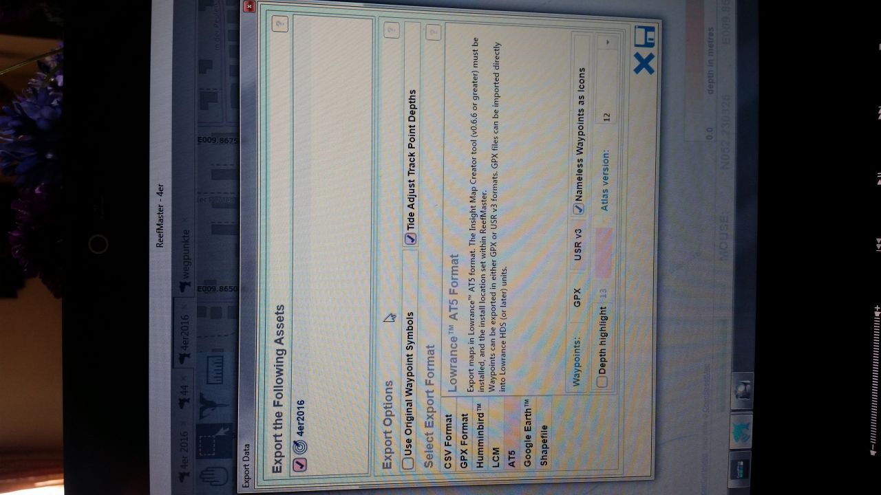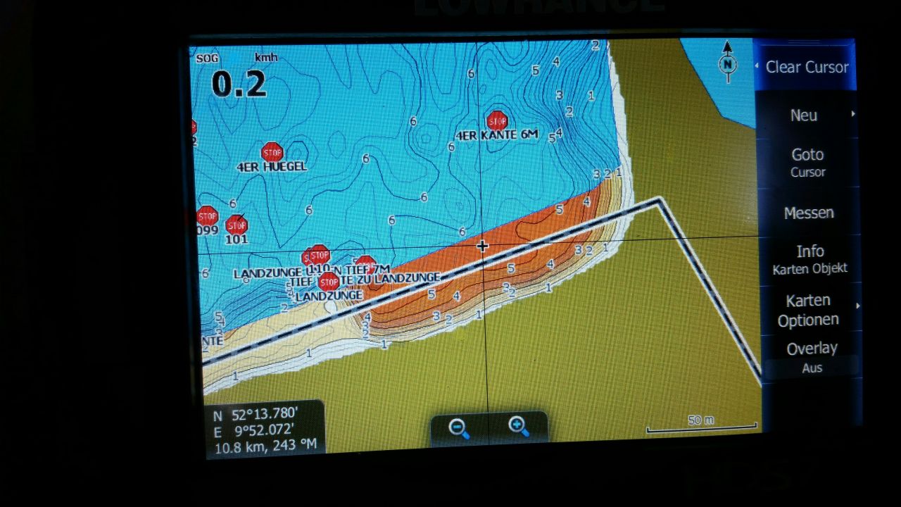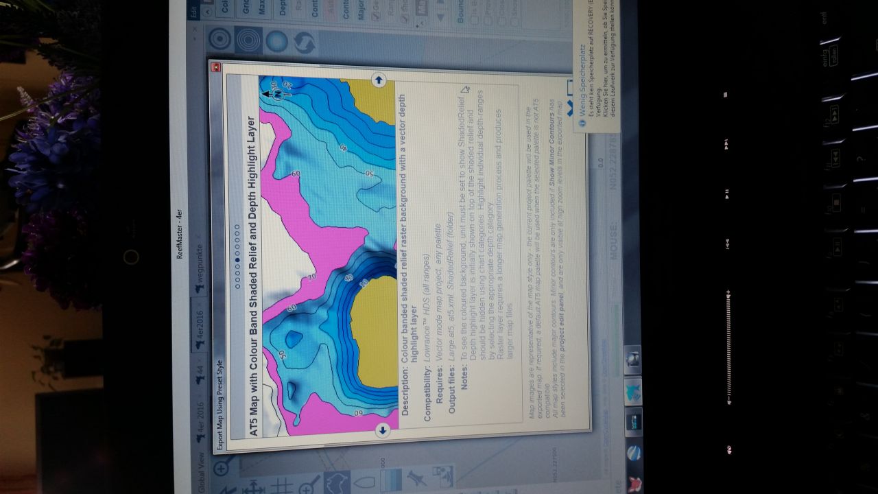So habe jetzt bei RF Ausgabe den ersten Punkt genommen und wie es aussieht geht es. Mein Problem ist wohl wie ich eben gesehen habe das die Deutschland Karte die auf der SD karte für das Echolot ist meine erzeugte überblendet. meine Farben sieht man nicht da von der Deutschland karte der eingezeichnete See in blau ist und meine Daten somit verdeckt. Ist aufgefallen weil die Deutschlad Karte nicht 100% zu dem tatsächlichen See past der ist etwas anders. Nur wie ziehe ich jetzt das blau raus . oder muss ich eine neue Deutschladkarte haben ? oder was am Echolot umstellen? habe Fotos im Anhang was ich meine. Meine erzwugte Karte sieht man unten rechts ein bissen im orange.
