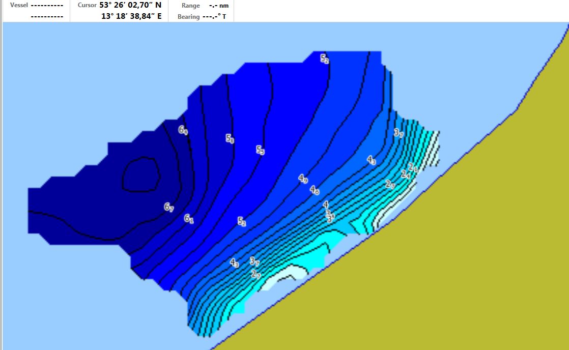 Eine Skala am Bildschirmrand haben wir vor Urzeiten schon mal im HDS getestet, jedoch nicht wirklich am Bildschirmrand, sondern am Kartenrand, eingebettet in die Karte. Letzten Endes macht so ein Teil nur Sinn, wenn man unskalierte Werte erläutern will. Da man es aber mit beschrifteten Tiefenlinien recht einfach hat zu schauen, was was ist, sind wir wieder davon abgekommen. So eine Darstellung würde aber zum Beispiel Sinn machen, wenn man den Bodenhärtestrukturen Texturen/Farben zuordnet, die den realen Gegebenheiten entsprechen (Beispiel: Textur/Farbe 1 - Schlamm, Textur 2 - Feinsand,  ....).