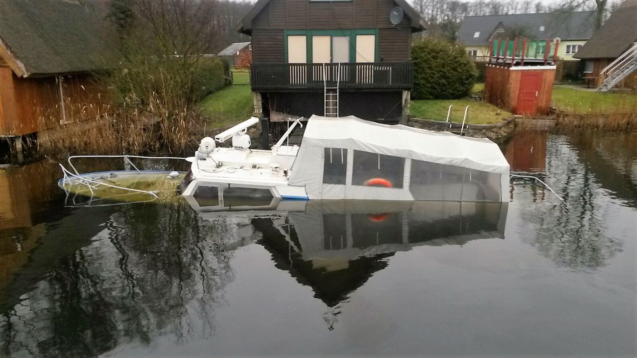 Nur noch die Aufbauten und die Persenning ragen aus dem Wasser. Foto: WSPI Waren