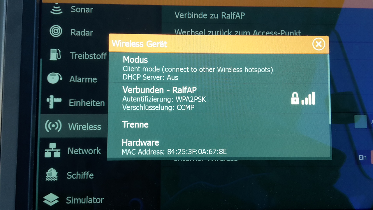 Verbunden war ich mit meinem Telefon Samsung S5 mini über "Mobile Hotspot" mit einer sehr guten HSDPA Verbindung. Laut Speedtest ca. 7 MBit/s im Downstream (und ich glaube nicht das Navico/Lowrance vor dem Anbieten einer SW, erst den Check auf stabile Internetverbindung durchführt... traue ich denen einfach nicht zu ;-) ). Letztendlich bekam ich aber wieder nur die Meldung, dass nicht von diesem Ort aufdatiert werden kann. Zu Hause WLAN ist keine Option, da ich erstens das Boot nicht so einfach dort hin bekomme und zweitens wohne ich auf einer Insel auf der das Internet per DSL nur knapp 1MBit/s Downstram bietet :-(.  Da bin ich mit dem Handy besser/schneller.