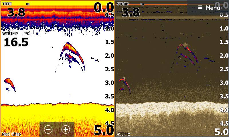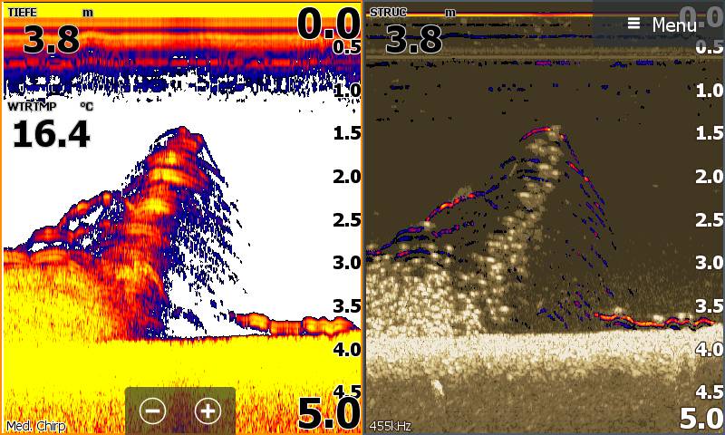 • My/Mein Echo Equipment: Simrad GO7 XSE mit TotalScan-Geber und Navionics+ Karte, Lowrance Mark5X Pro mit 83-200-Geber, ein 500g-Senklot mit 100 Meter Maurerschnur