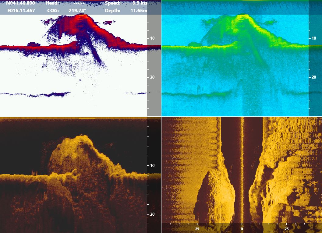 The second picture shows primary and secondary channels for sonar , +downscan and sidescan.