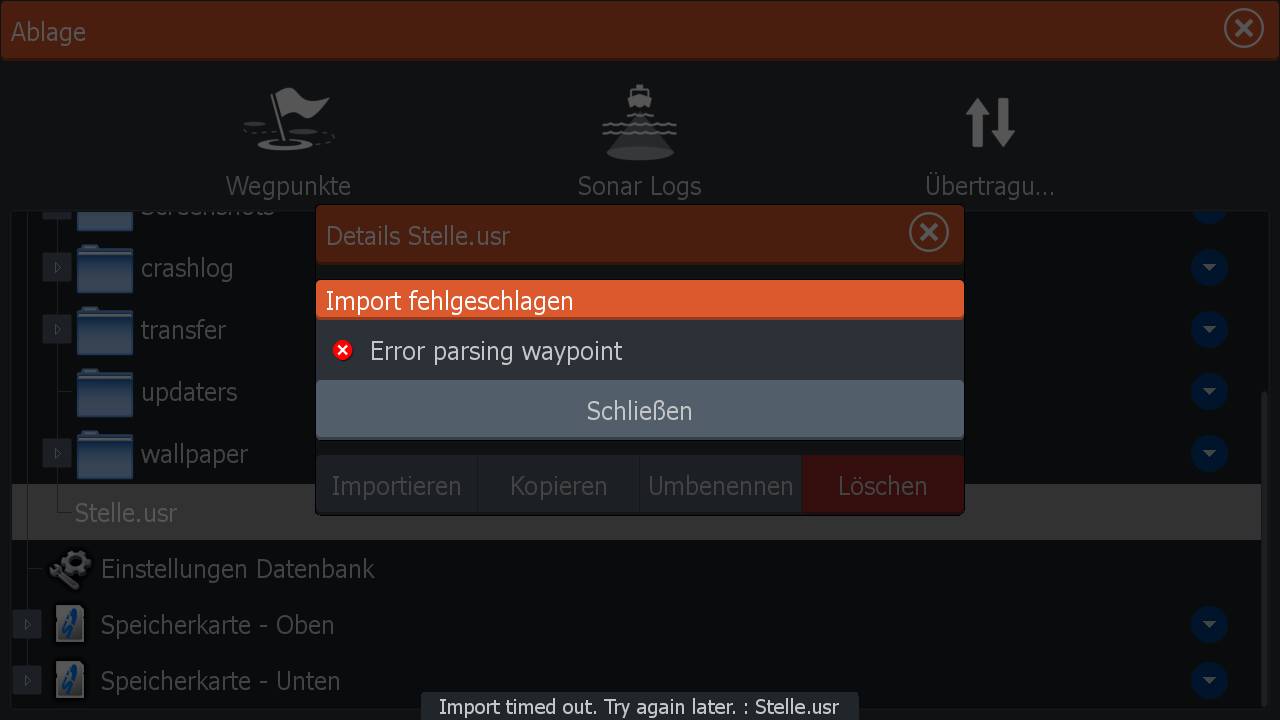 erstellt. Wenn ich es jedoch importieren will, bekomme ich sofort den Fehler "error parsing waypoint". Am unteren Bildschirmrand zeigt mir das Gerät dann eine Meldung an: "import timeout. try again later."