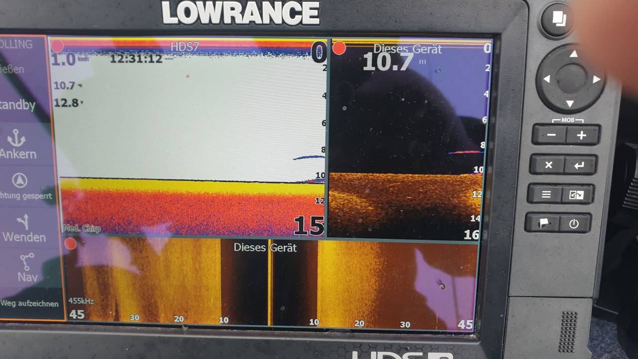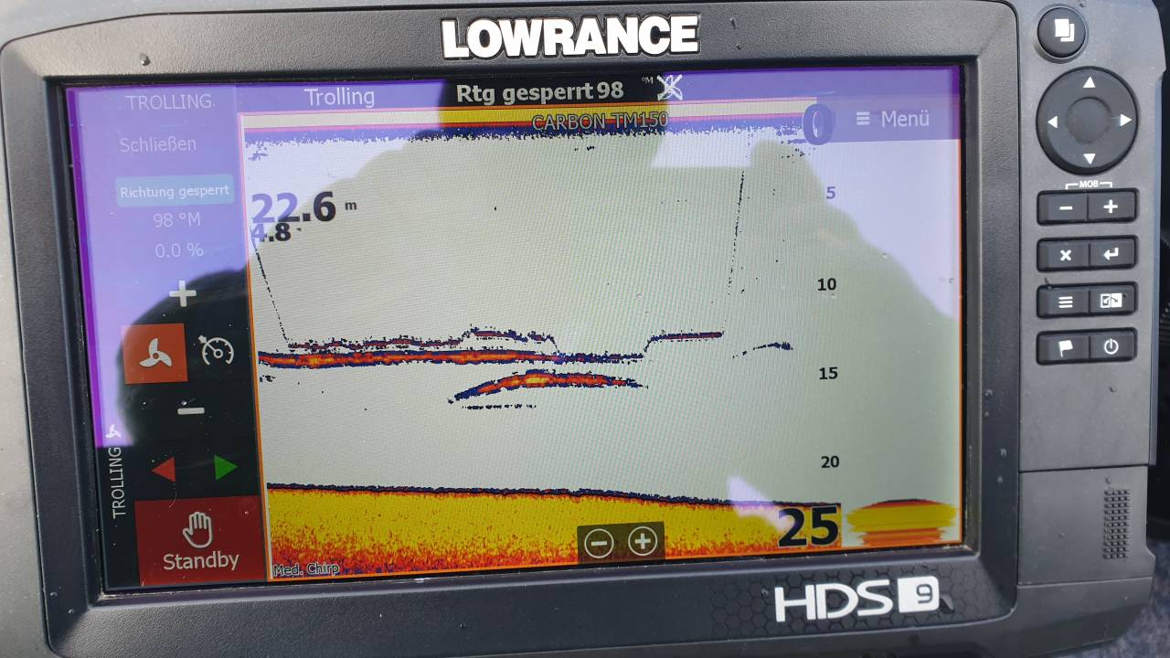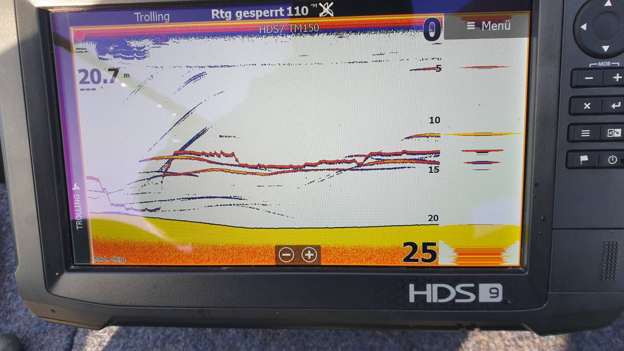 Wir hatten uns bei einem Kumpel am verankerten Boot (Bugmotor) festgemacht. Als ich das HDS9 abbauen wollte meint mein Kumpel das er den Fisch den er auf ca. 9m erspäht hatte anzuangeln, war nix, der Köder unterm Geber war gut zu erkennen. Bild1