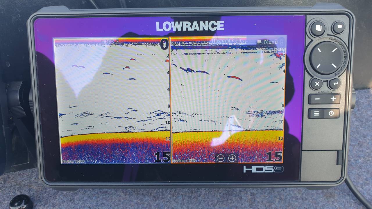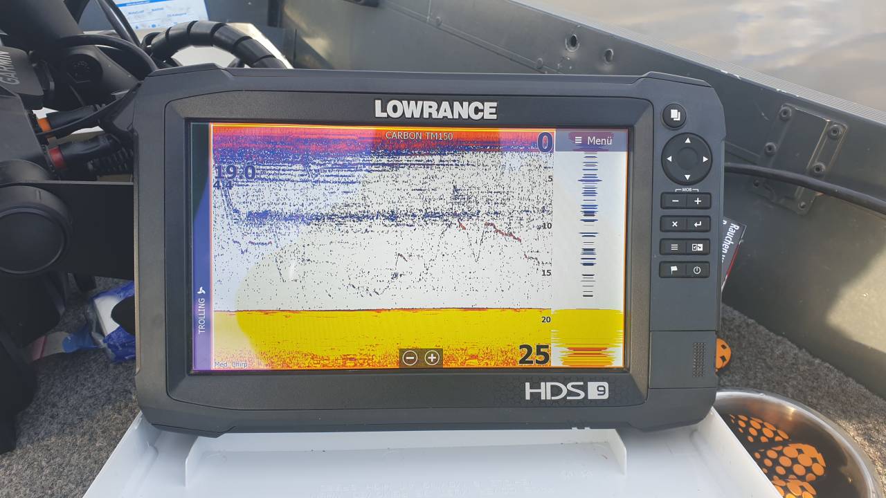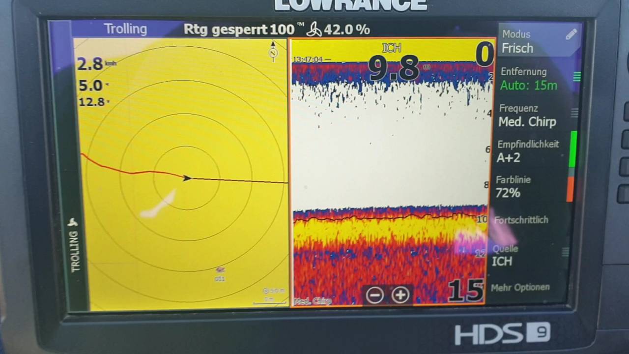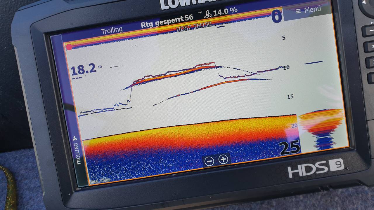 Wir hatten uns bei einem Kumpel am verankerten Boot (Bugmotor) festgemacht. Als ich das HDS9 abbauen wollte meint mein Kumpel das er den Fisch den er auf ca. 9m erspäht hatte anzuangeln, war nix, der Köder unterm Geber war gut zu erkennen. Bild1