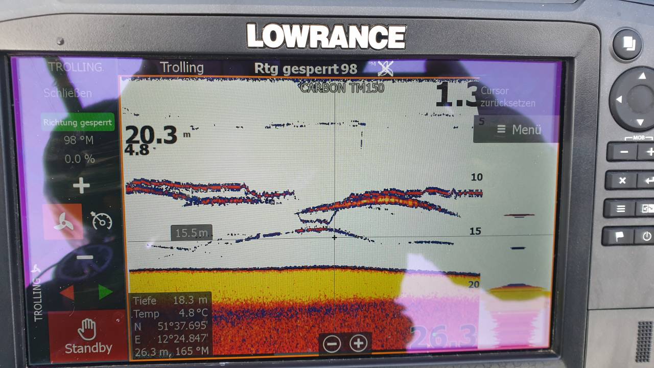 • My/Mein Echo Equipment: Simrad GO7 XSE mit TotalScan-Geber und Navionics+ Karte, Lowrance Mark5X Pro mit 83-200-Geber, ein 500g-Senklot mit 100 Meter Maurerschnur