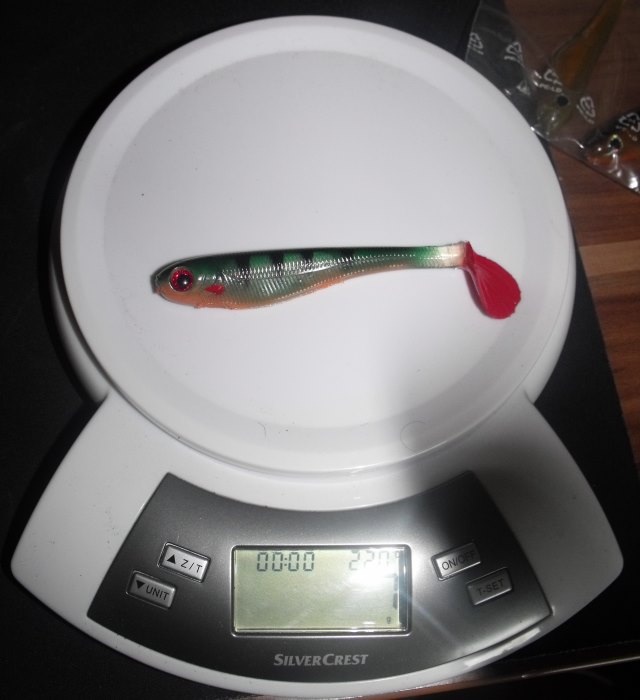 Hier noch ein Foto zum Gewicht des Berkley Powerbait Split Belly, ca. 22gr, könnte also auch im Sommer unbeschwert (Weightless) klappen.