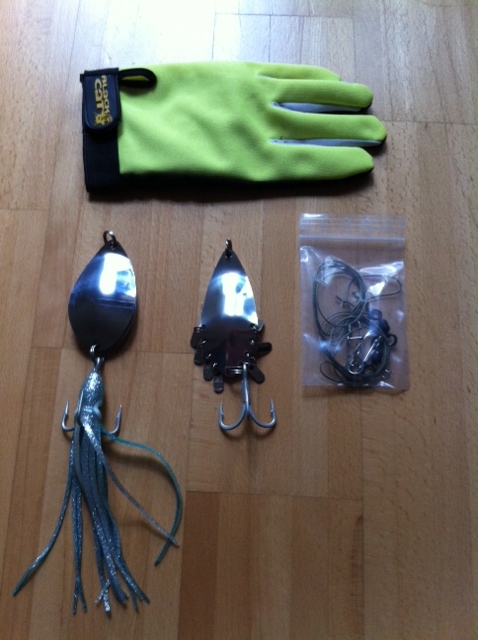 paar neue Wallerblinker vom Jörg, n bissel Zubehör und n Landehandschuh. Mit der Spinnkombo muss ich noch n Termin fürs Fotoshooting ausmachen  :fiesgrins: