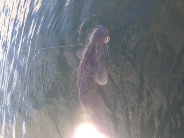 Christian, der freundlich winkende Angler mit der extrem gebogenen Rute, drillte den Fisch auf mich zu. Als dieses riesen Maul auf mich zukamm, dachte ich an "Der weisse Hai", so sah das ungefähr aus.