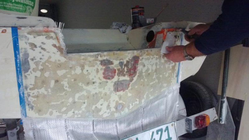Als diese dann eingepasst und verschraubt war machte ich mich dann ans laminieren mit Glasfaser, Gewebematten und Epoxi von West System.