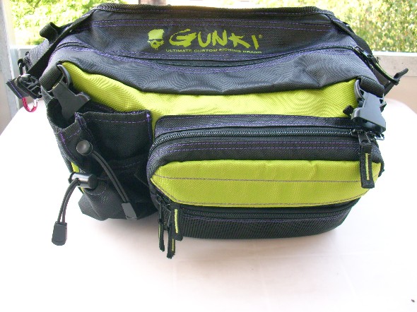 Die P&M Gunki Walk Bag hat eine sehr große Tasche für Köder/Jigs u.s.w. eine kleinere für Vorfächer Zangen u.s.w. dann wieder eine etwas schmalere für die Papiere oder so und eine aufgesetzte Netztasche.