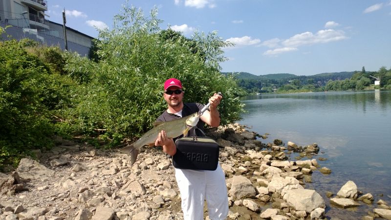 Nach ein paar Würfen, sah ich wie neben mir das Wasser brodelte und viele kleine Fische an der Oberfläche ums Leben kämpften. Sofort überwarf ich die Stelle mit meinem Stickbait. Kurz vor meinen Füssen, war schon gedanklich beim nächsten Wurf, knallte mir ein Brocken von Rapfen rein. Der Drill war der Hammer, immer wieder versuchte er mir Schnur von der Rolle zu nehmen.