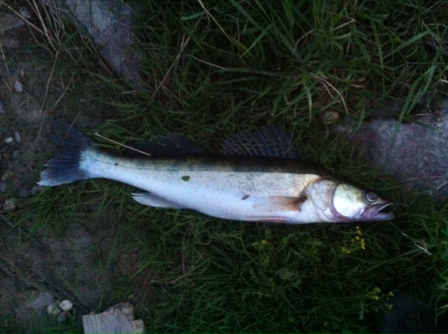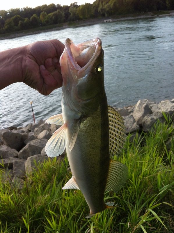 Nach etwa zwei Minuten nachdem ich mein langersehntes Feierabendbier geöffnet hatte, gabs nen schlag und die Schnur lief von der Steinpackung weg. Nach kurzem, aber verhältnismäßig hartem Drill konnte ich dann einen schönen Zander landen.