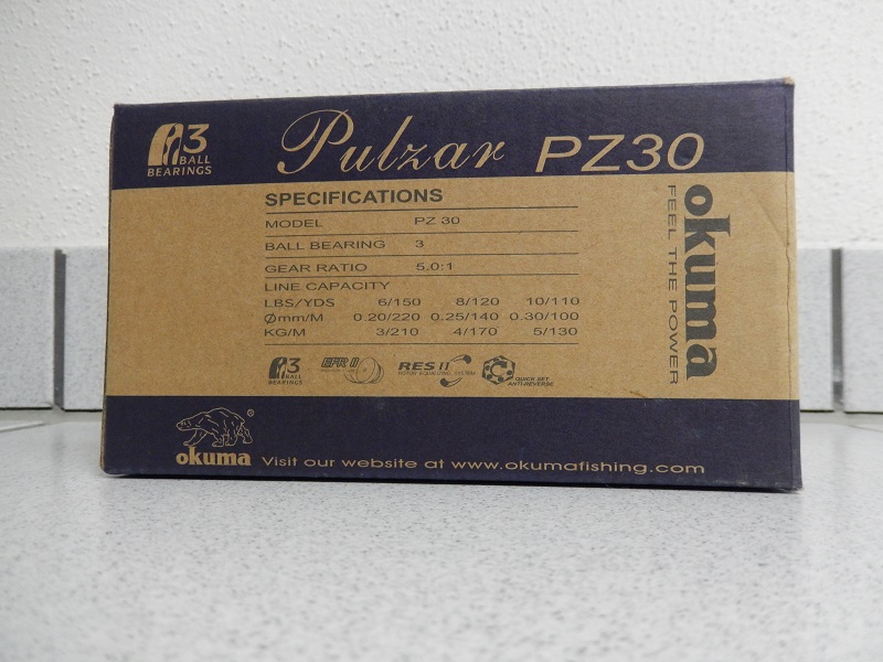 Diesmal eine Stationärrolle der Firma Okuma, Model Pulzar PZ 30. Die Rolle hab ich ein paar mal gefischt, die Bremse arbeitet absolut ruckfrei ! sie befindet sich immer noch in einem guten gebrauchten Zustand. Mit dabei ist eine Ersatzspule aus Graphit, die Daten der Rolle hab ich euch mal vom Kartong abfotografiert, welcher natürlich noch vorhanden ist.