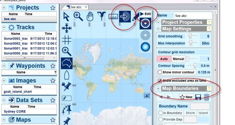 Uferlinie und Inseln in Reefmaster importieren.Nach Laden der Tracks und Zuordnung zu einem Projekt,