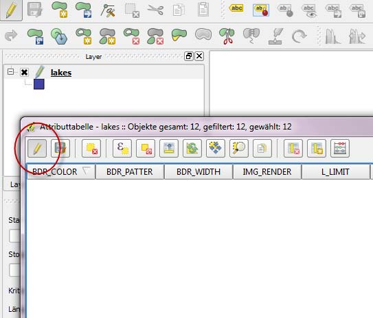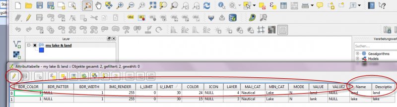 korrekter Struktur in der Attributtabelle. Links sind alle Attribute aus "lake" und