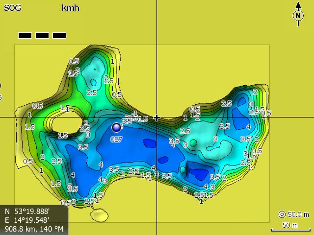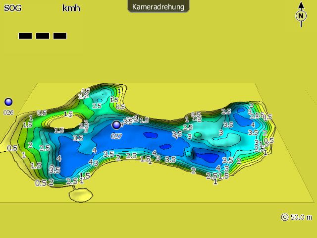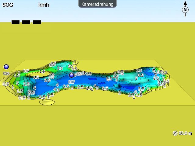 Beim Drehen der Karte bleibt die räumliche Illusion bestehen. Wie angedeutet geht das aber nur bei kommerziellen Karten, etwa Navionics bzw. in der 3D-Ansicht von RM, wo man ja den See entsprechend drehen kann.