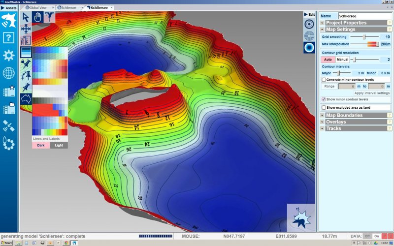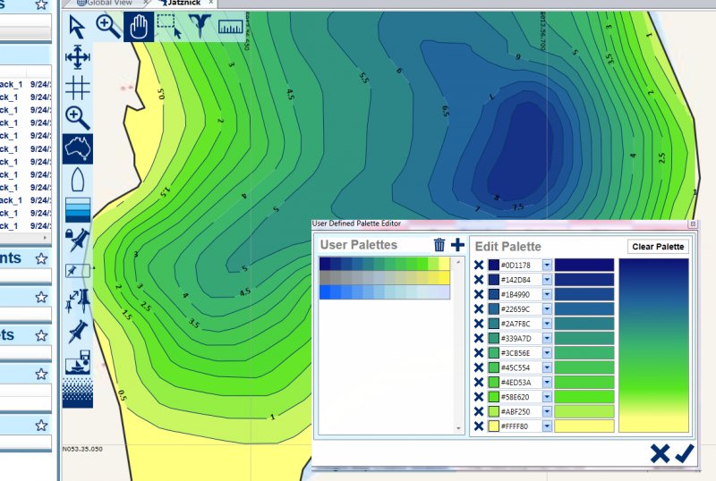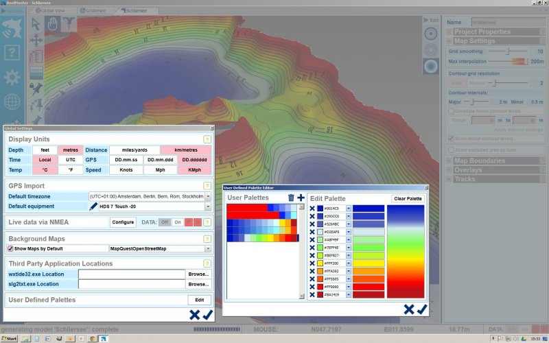 Mit Settings - User defined pallettes - lassen sich Farbfolgen erstellen, auch ähnlich dem DrDepth Farbschema. Wenn man die Einstellungen bei den Contour Intervals z.B. auf 2m setzt, dann kann ein See auch so aussehen: