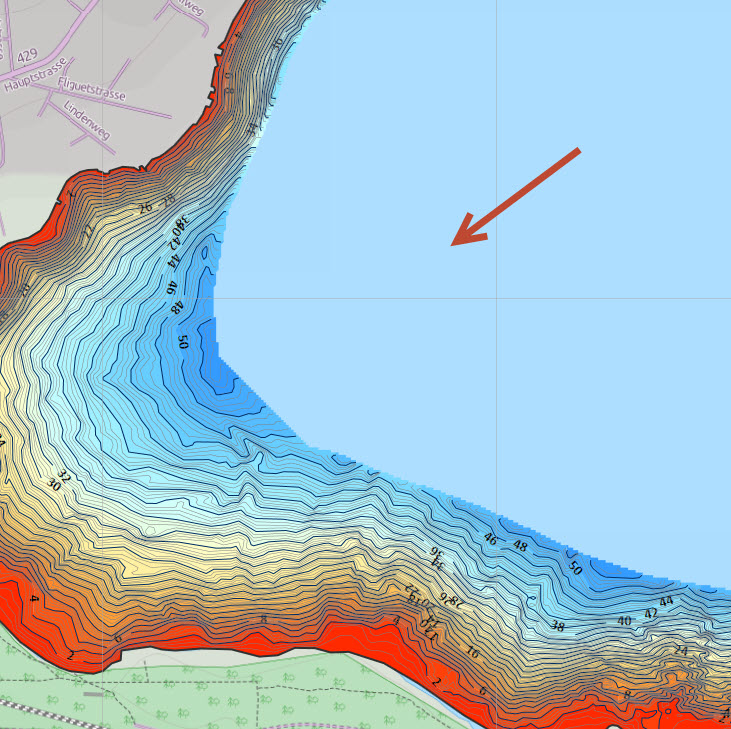Meine im RM erstellte Karte deckt nur einen Teil des ganzen Sees ab. Wenn ich nun die AT5 Datei plus die OSM-Karte auf dem HDS Gerät habe ist ausserhalb meiner AT5 Karte kein Gewässer aus der OSM Karte mehr zu sehen. Das heisst im angehängten Bild aus dem RM ist die übrige Seefläche (roter Pfeil) welche ich nicht abgefahren bin blau dargestellt. Auf dem Echolot ist diese Fläche aber grün dargestellt. Wird diese Fläche überdeckt oder wo könnte der Fehler liegen?
