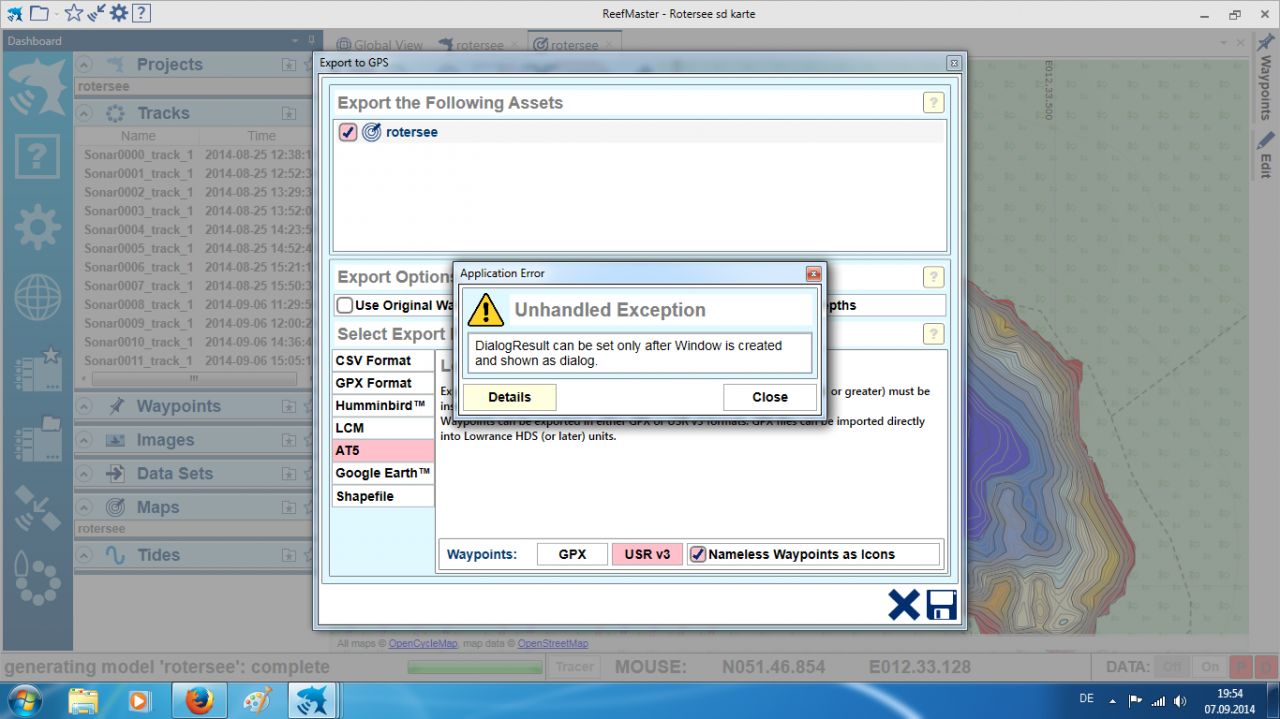 JA das habe ich beim durchstöbern der älteren Beiträge schon gemerkt das jetz so einiges anderst aussieht, und kaum habe ich das eine Problem beseitigt tritt jetzt das nächste auf: Ich möchte nun eine AT5 Datei für mein Lowrance erstellen (lt. der Kurzanleitung dazu hier aus dem Forum) und nachdem ich speichern drücke und den ordner für die Datei wähle(meine Sd-Karte) kommt jedesmal diese Meldung (siehe Anhang), was mache ich da schon wieder falsch ich hab doch die user map richtig erstellt. Danke schonmal wieder für Hilfe. Mfg Lukas