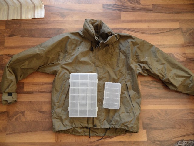 Shimano Regenjacke in L ...ist aber weiter geschnitten (für einen Bauch auch XL tauglich) müsste nur gewasschen werden.Liegt ca. ein Jahr im Keller.