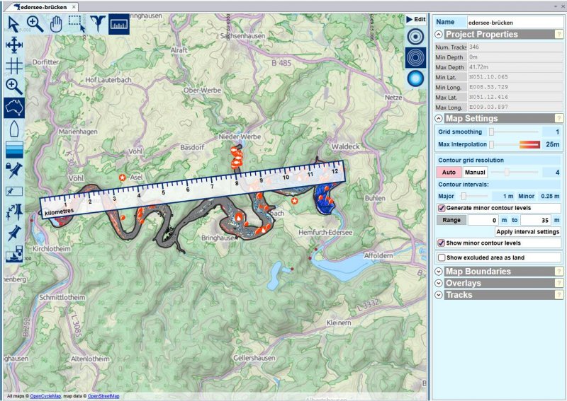 Und das dritte: Warte auf das neue Update, das bietet eine 64 Bit Architektur und kann deinen Rechner / Arbeitsspeicher ausnutzen. Für die großen Gewässer sollte dies deutliche Performance-Gewinne bringen bzw. dies erst ermöglichen. Den Chiemsee mit einer Map-Fläche von etwa 10 x 16 km kann ich mit der 32-Bit-Version gar nicht in einem Stück rendern lassen.