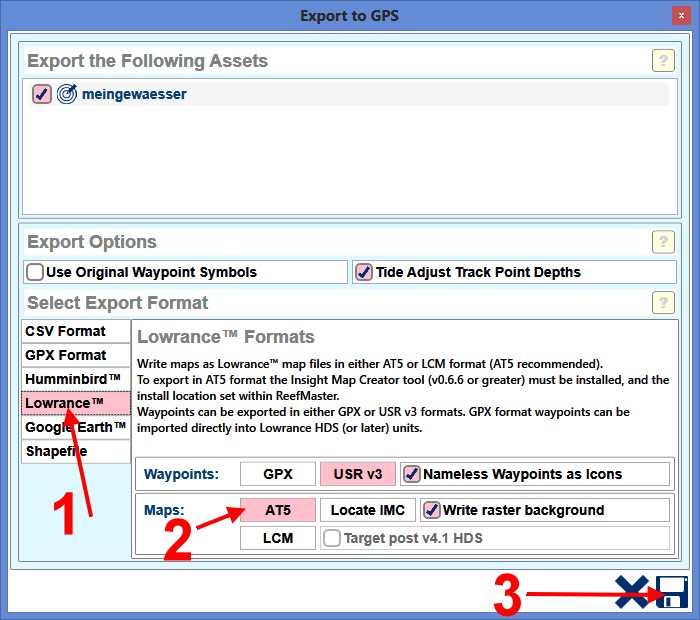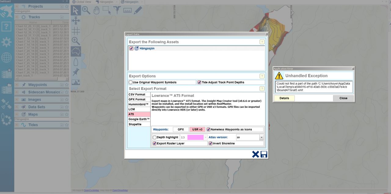 ich habe folgendes Problem. Ich bekomme beim Export (Erzeugung at5 direkt) diese Fehlermeldung. Ich habe mir gestern die Pro-Version von RM gekauft. Ich konnte ebenso eine Karte über Shapefile i.V.m dem IMC erzeugen (siehe Bild 2 und 3). Da muss ich noch bissl feilen, bis die Tiefenanzeigen (Anzahl der Zahlen) passen.