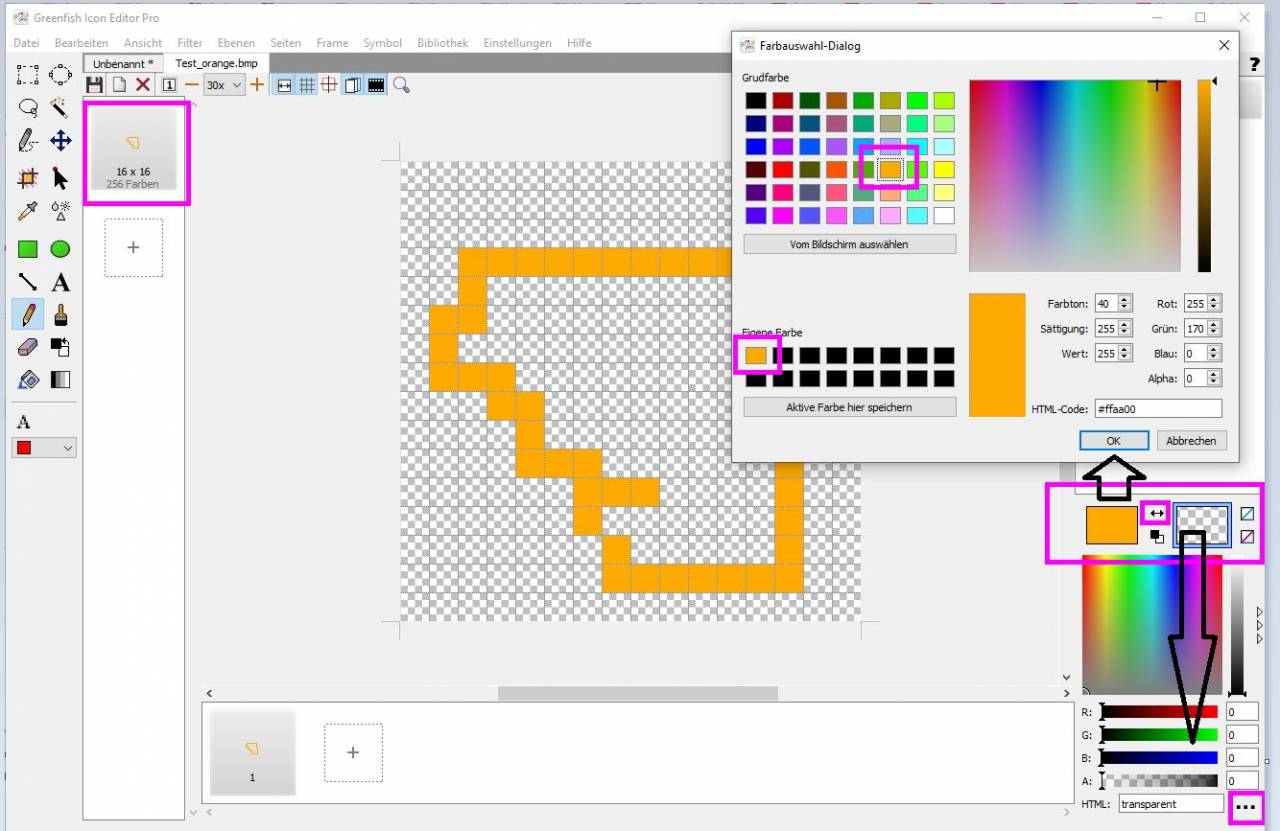 I copied an icon from the database using the Snipping Tool in Windows and imported it into Greenfish. This creates a new layer. The layers are stacked on top of each other, and their transparency is adjusted so that both are visible. Then, the additions/changes are made in the new layer. Finally, the transparency is removed, the icon is exported, and inserted into the IMC.