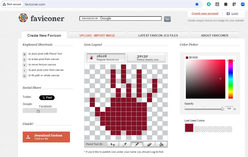 I wanted to create an ochre hand print icon to represent locations on a map of Anishinaabe pictographs found along shoreline cliffs in Canada. There are a lot of different types of pictograph images, but the simple hand print is one of the most common.  What I struggled with most was creating an icon with a transparent background.  Initially I tried to take a PNG file with a transparent background and resize the image to a suitable size.  I struggled with this as it seems resizing the image changes the background to be non-transparent.  Perhaps I was not using the correct tool as I am not a graphic artist.